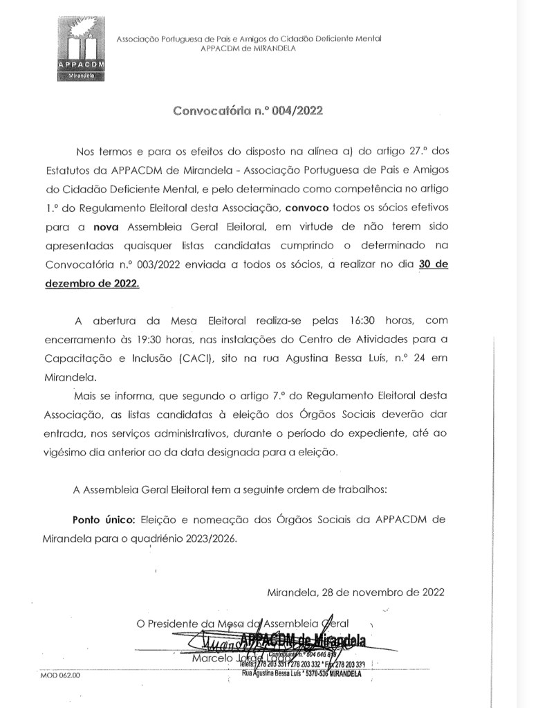 Considerando as eleições para o novo mandato da APPACDM de Mirandela, apresenta-se abaixo a Convocatória e Regulamento Eleitoral.